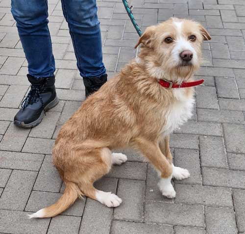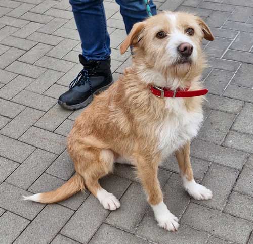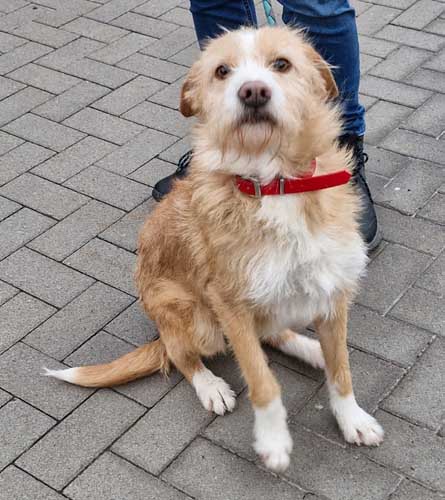 Sie ist mittelgroß, wiegt etwa 15 kg und kam ursprünglich als Fundhund aus Portugal zu uns. Nun sucht sie Menschen, bei denen sie ankommen und Vertrauen aufbauen darf.