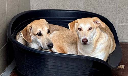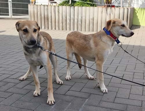 Betty und Bonnie sind Geschwister. Beide sind sehr schüchtern und befinden sich noch in der Eingewöhnungsphase. Menschkontakt, an der Leine laufen, auf einer Wiese sein.. viele Dinge lernen sie nach und nach kennen.