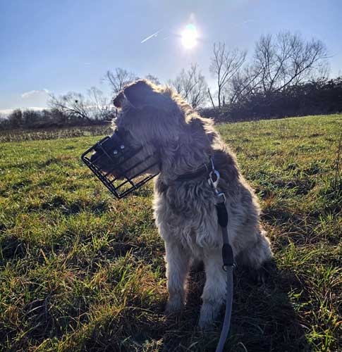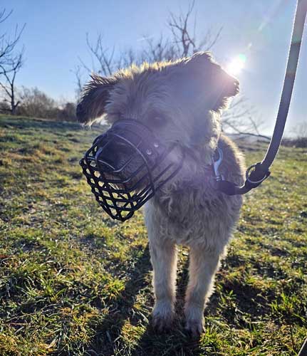 Er verteidigt Futter und Leckerlis und reagiert impulsiv, wenn man ihn z.B. versehentlich am Fuß trifft. Er kennt den Maulkorb – und gerade zu Beginn sollte dieser aus Sicherheitsgründen eingesetzt werden.