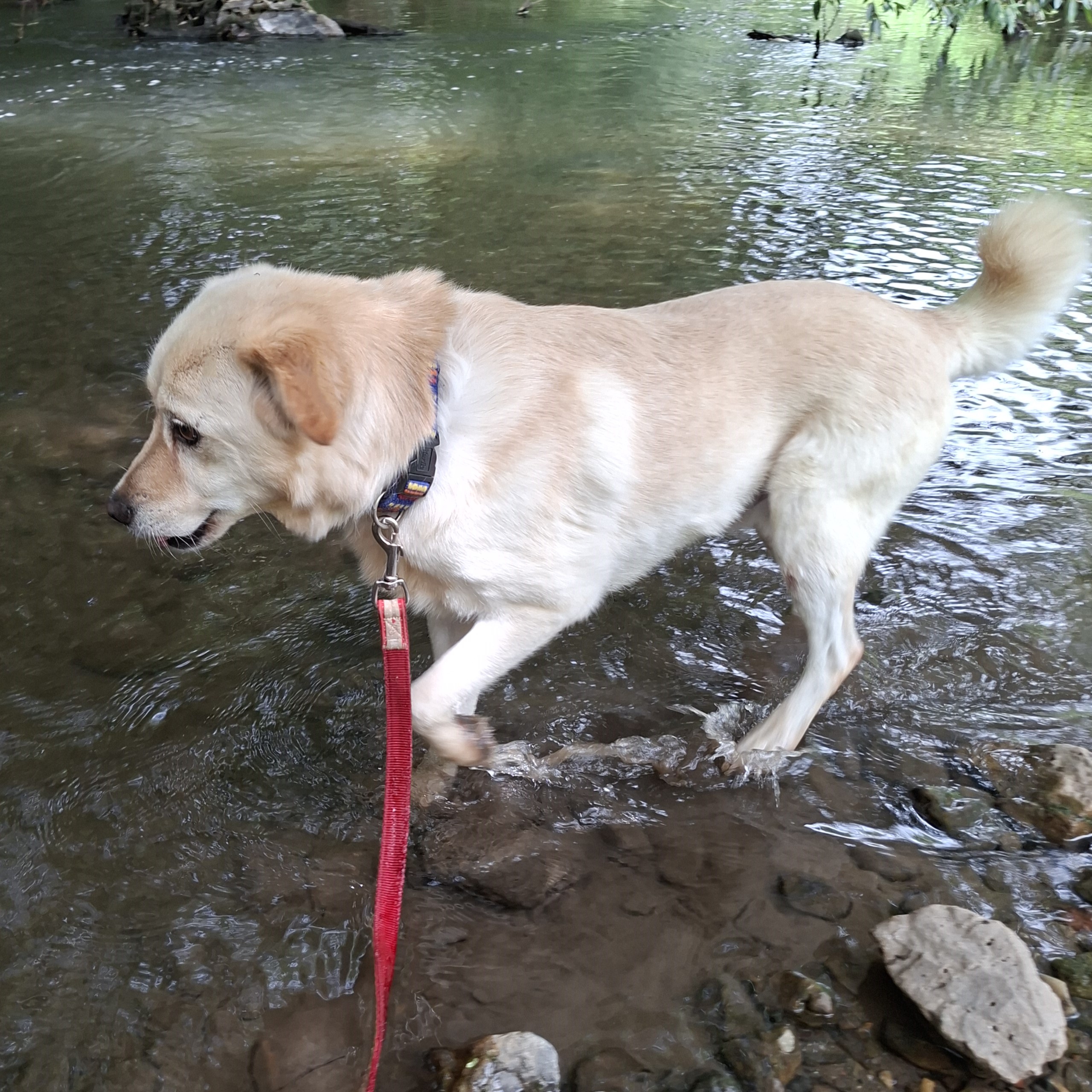 Er läuft tadellos an der Leine. Besonders liebt er Wasser und freut sich über Ausflüge an den Fluss.